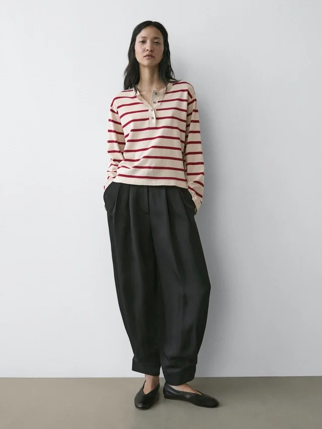 Sweater Made of Cotton Fabric. Long Sleeves. Round Buttoned Neck. Striped Detail.