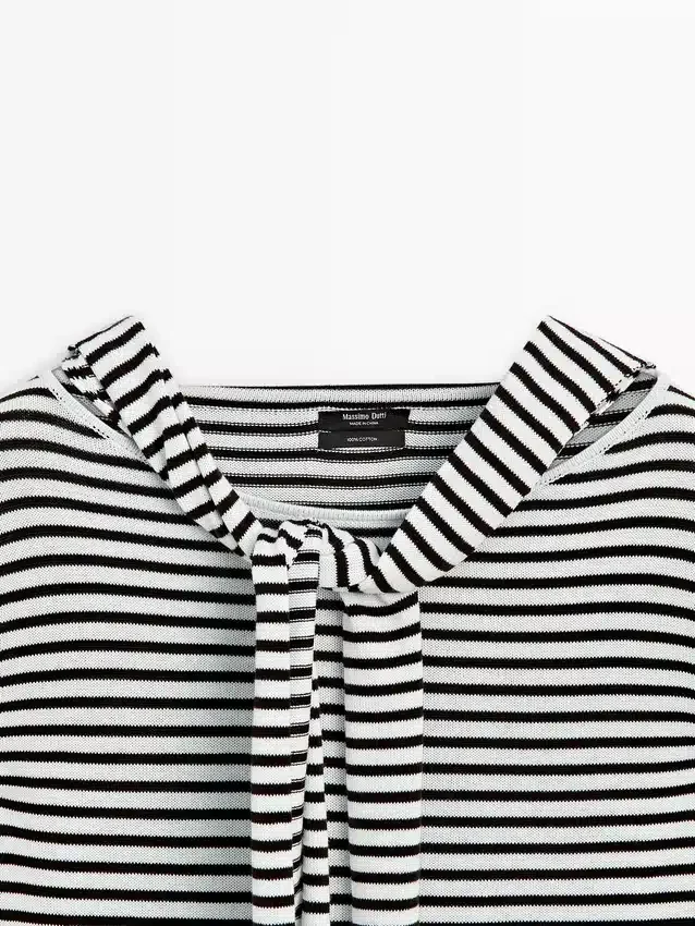 Knit Jumper Made of Cotton Fabric. Crew Neck. Long Sleeves. Striped Print. Multi-Position Sleeve Detail.