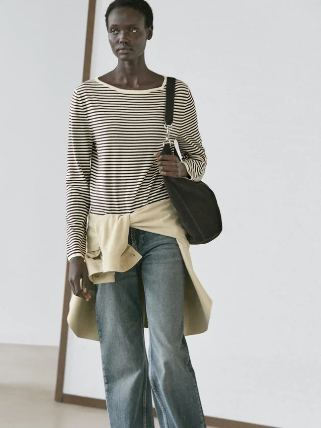Cotton Blend Knit Sweater. Long Sleeves. Boat Neck . Striped Print.