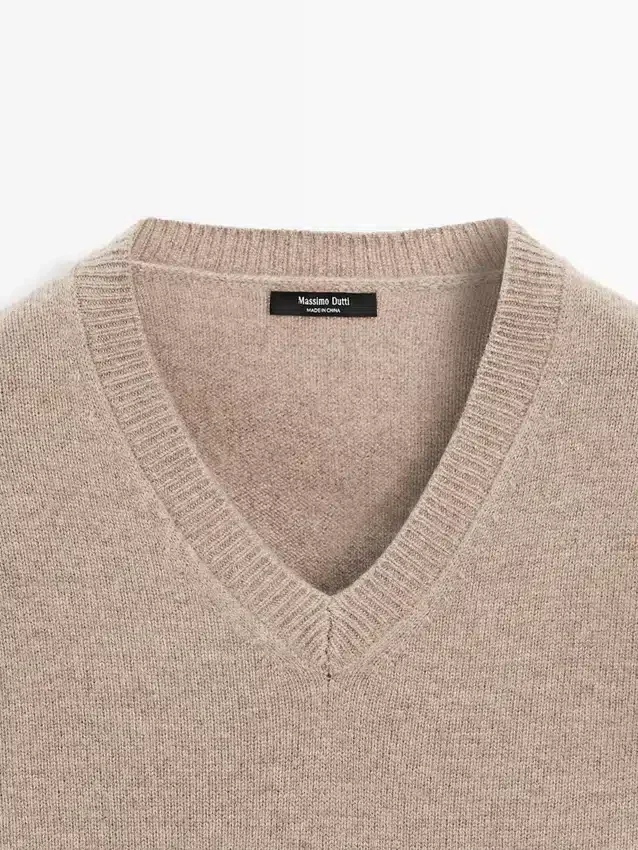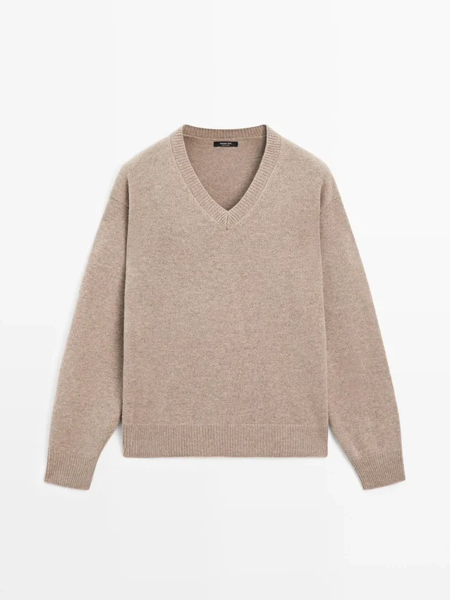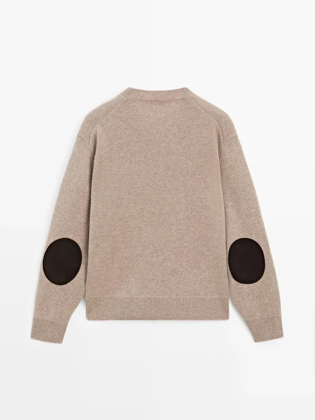 Knit Sweater Made of a Wool Blend Fabric . V-Neck. Long Sleeves. Contrast Elbow Patch Detail. Ribbed Trims .