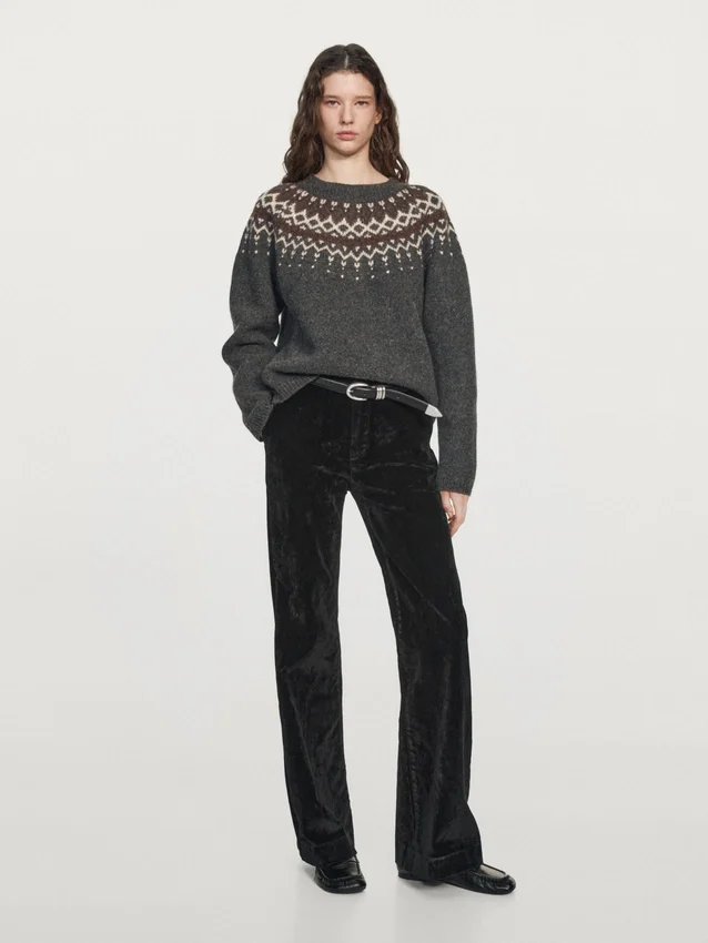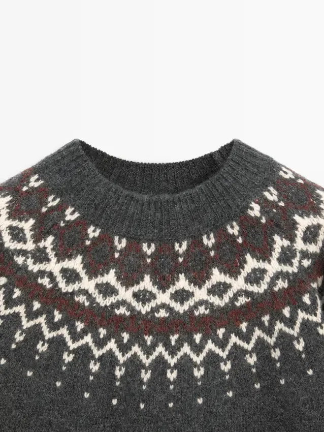 Sweater Made of Wool. Crew Neck. Long Sleeves. Jacquard Fabric. Ribbed Trims . Wide and Relaxed Silhouette, Not Tailored.