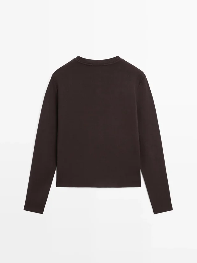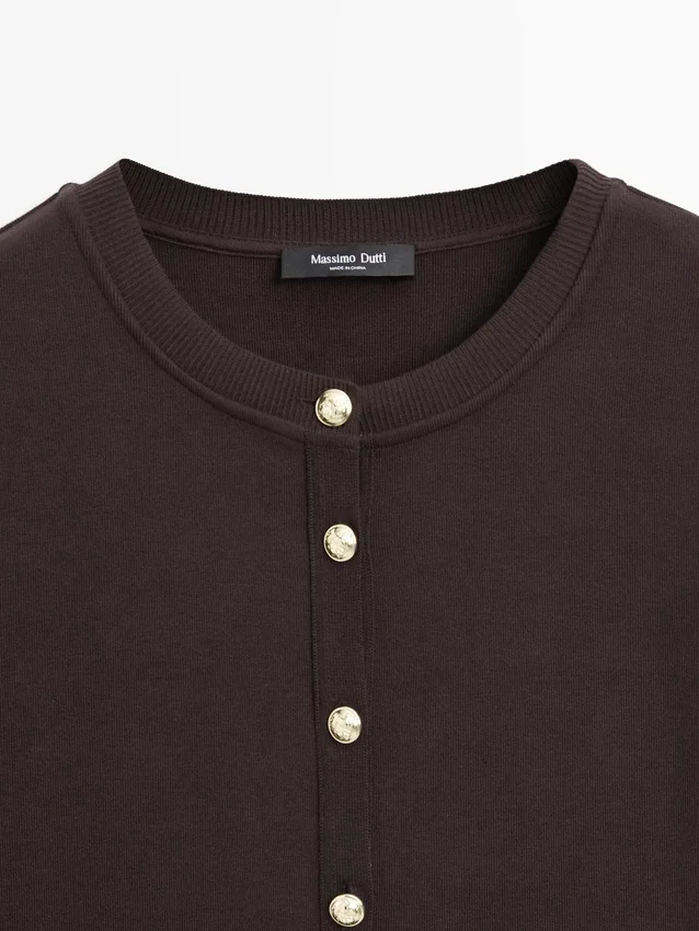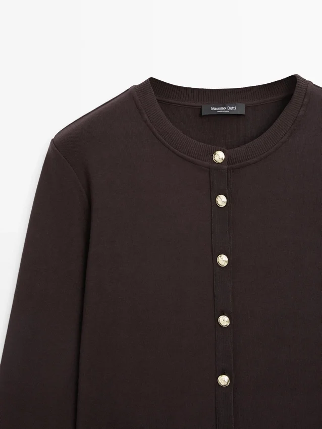 Cardigan. Crew Neck. Long Sleeves. Elegant Gold-Toned Rhinestone Buttons. Two Buttoned Flap Pockets .
