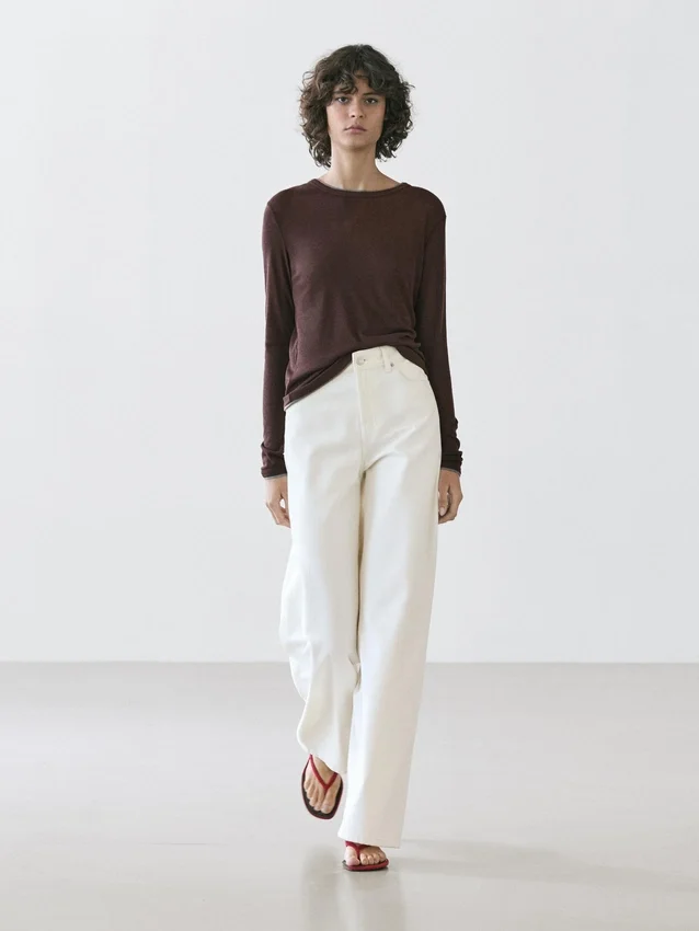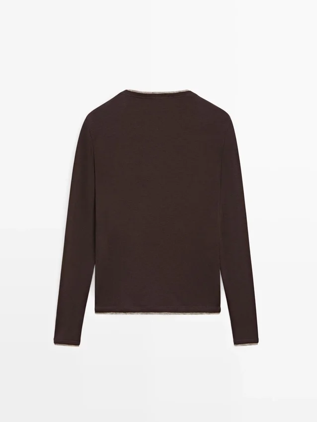 Wool and Lyocell Blend Knit T-Shirt. Long Sleeves. Double Fabric: Double Layer with Wool and Hidden Seams, Soft and Pleasant to the Touch.
