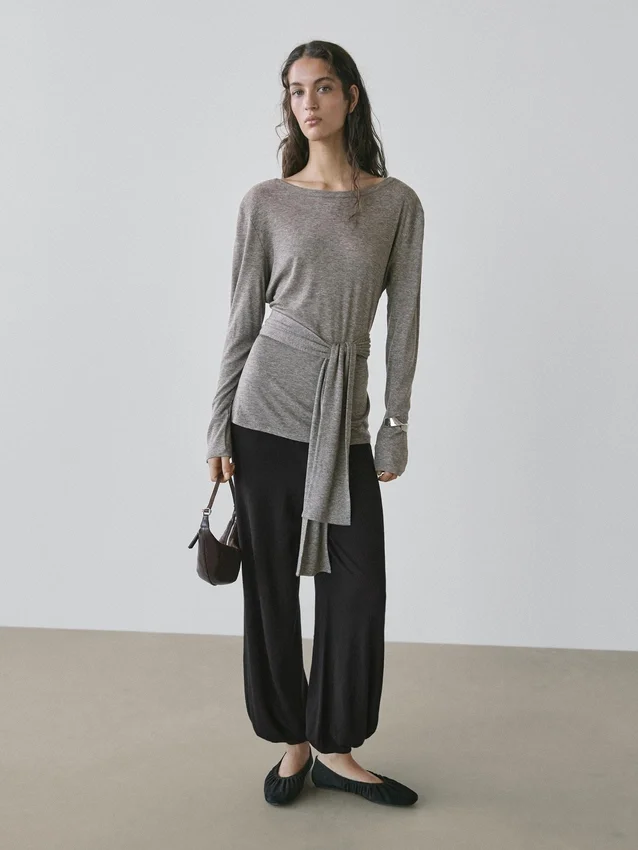 T-Shirt. Crew Neck. Long Sleeves. Tied Bow Detail on the Front.