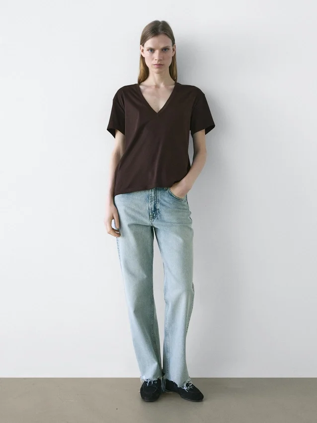 T-Shirt Made of 100% Cotton Fabric That’s Soft, Flowing and Slightly Shimmery. T-Shirt Made of Cotton. V-Neck. V-Neck . Short Sleeves. Regular Fit: This Fit Offers Comfort with a Little More Room in the Torso.
