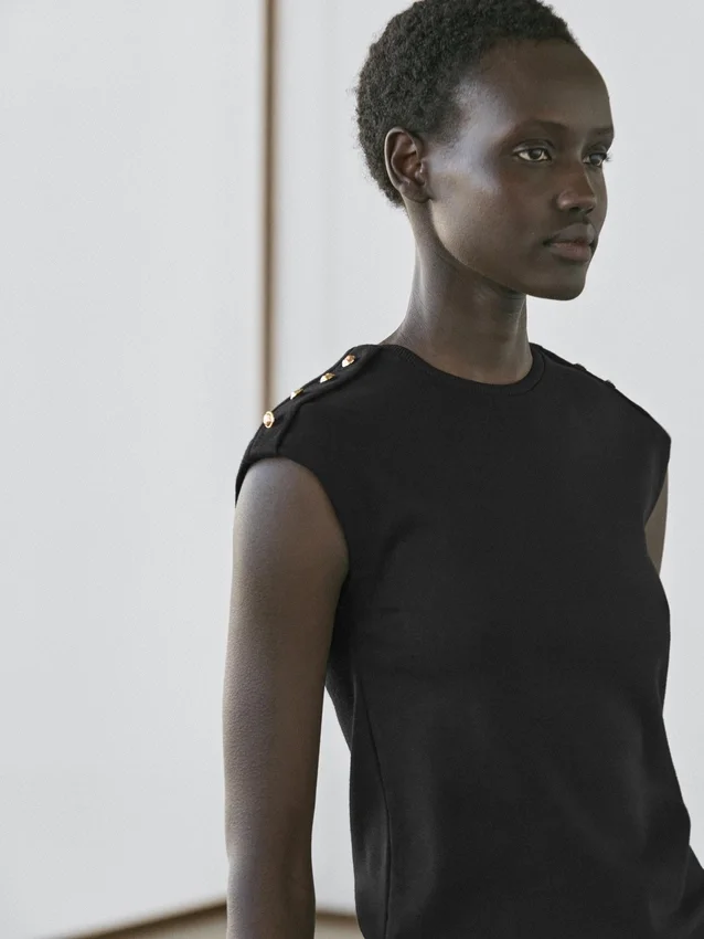 T-Shirt Made of a Viscose Blend Fabric. Crew Neck. Drop Sleeve. Button Detail on the Shoulder.