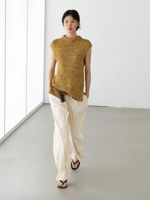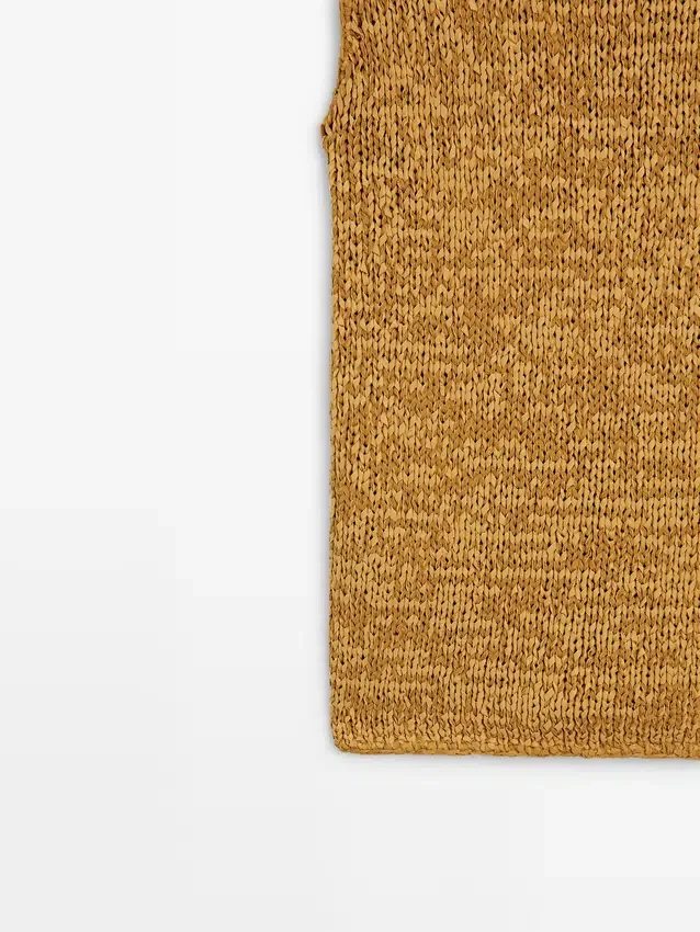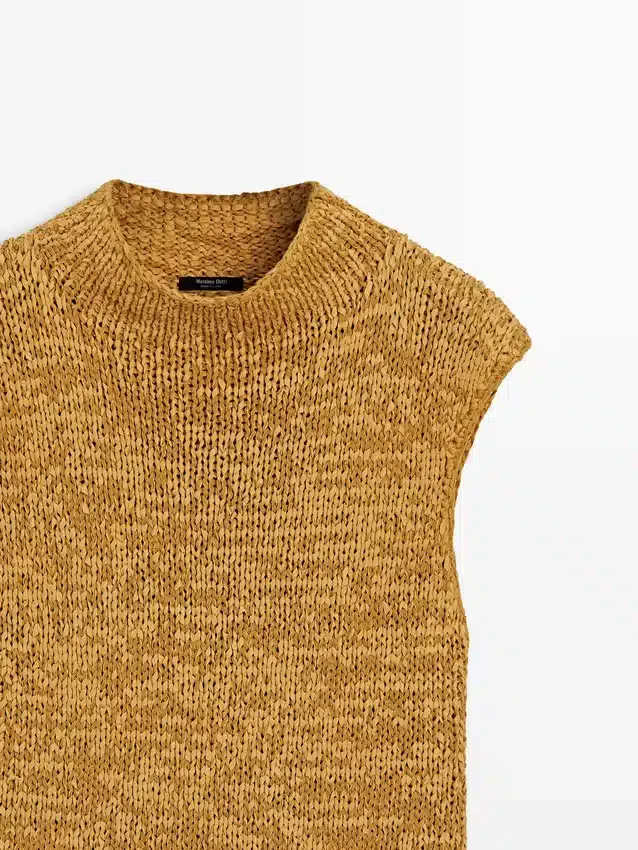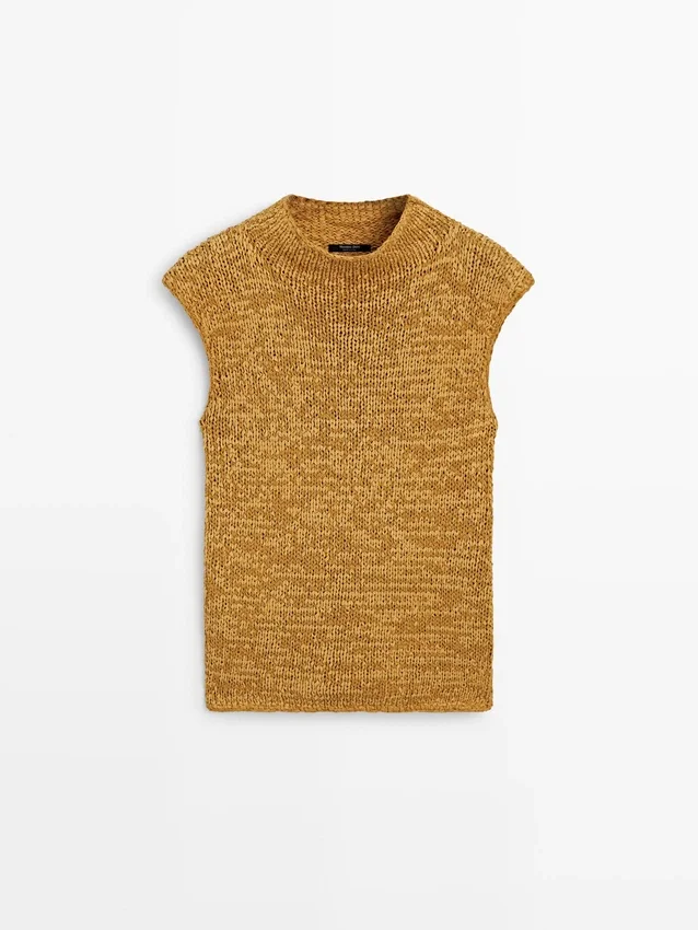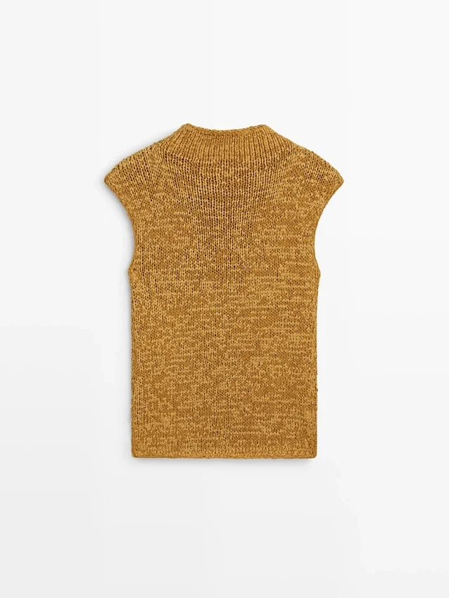 Chunky Knit Top Crafted from Cotton Blend Fabric. Features a Raised Round Neck and Sleeveless Design. Marled Finish Knit Detailing.