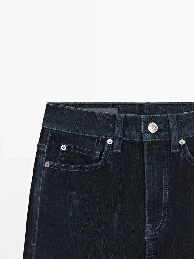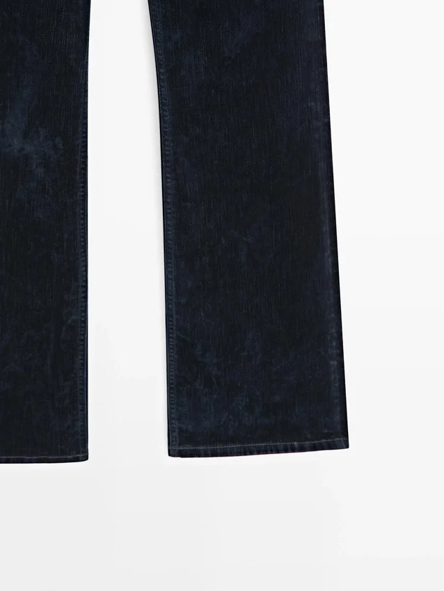Boot-Cut Jeans: Slim Fit, Fitted at the Waist and Thighs and Loose at the Hem. High-Rise. Front Zip and Top Button Fastening. Five-Pocket Design. Flock Finish, Velvety Effect, Soft to the Touch.
