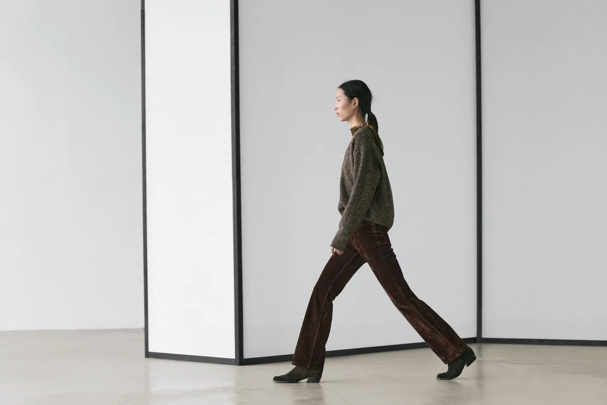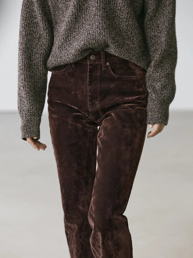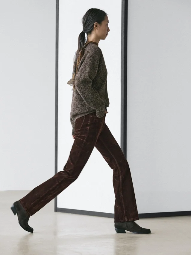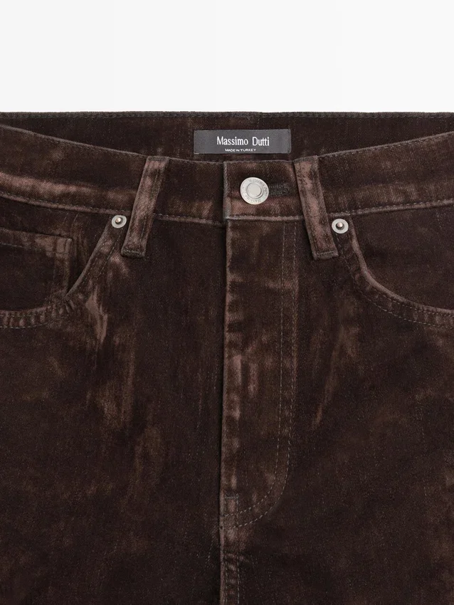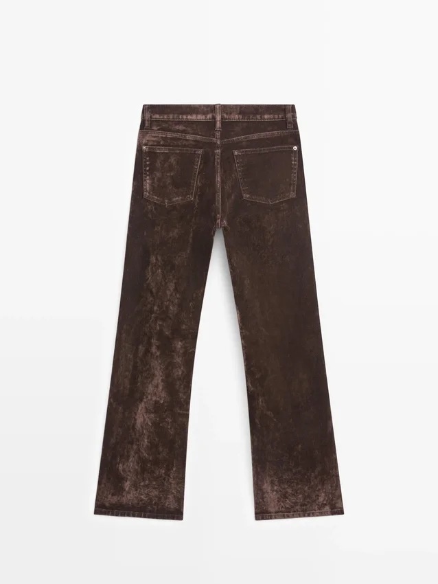 Boot-Cut Jeans: Slim Fit, Fitted at the Waist and Thighs and Loose at the Hem. High-Rise. Front Zip and Top Button Fastening. Five-Pocket Design. Flock Finish, Velvety Effect, Soft to the Touch.
