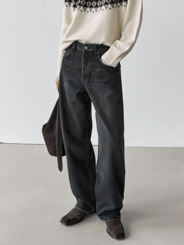 Balloon Jeans, Loose-Fitting Silhouette, Wide Legs and Ankle Fit. Button Fastening. Five-Pocket Design.