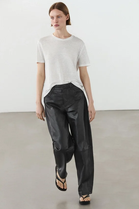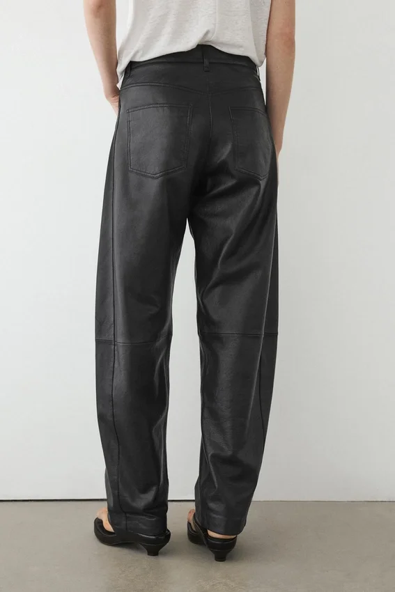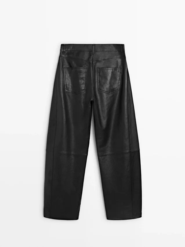 Trousers Made of Sheepskin with a Nappa Finish. Waistband with Belt Loops . Zip Fastening Concealed by a Placket, Press Stud and Buttoned Strap. Two Side Pockets. Two Patch Pockets on the Back. Lined.