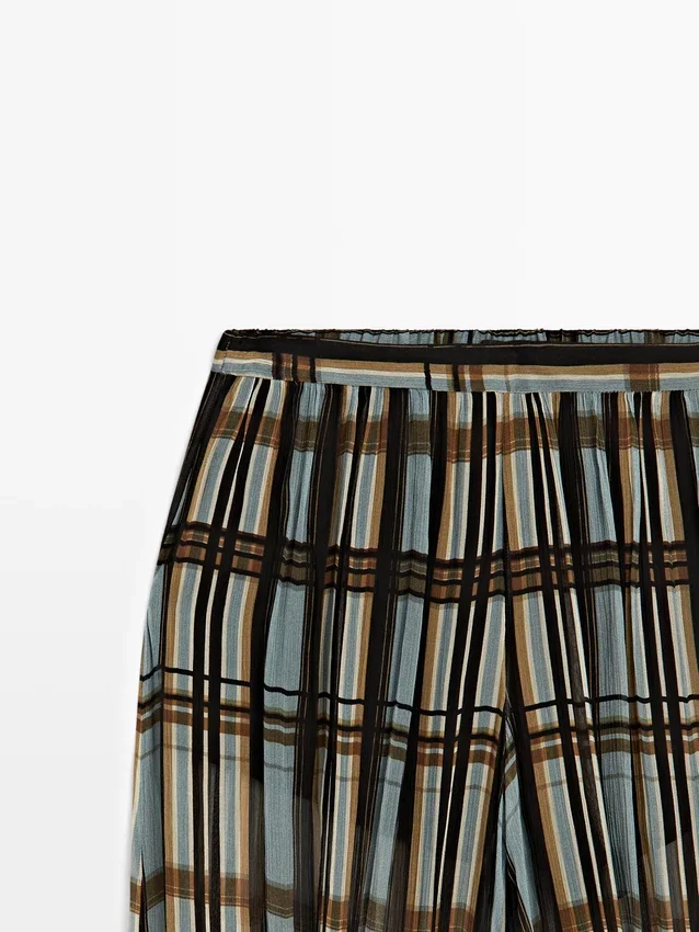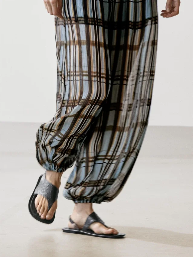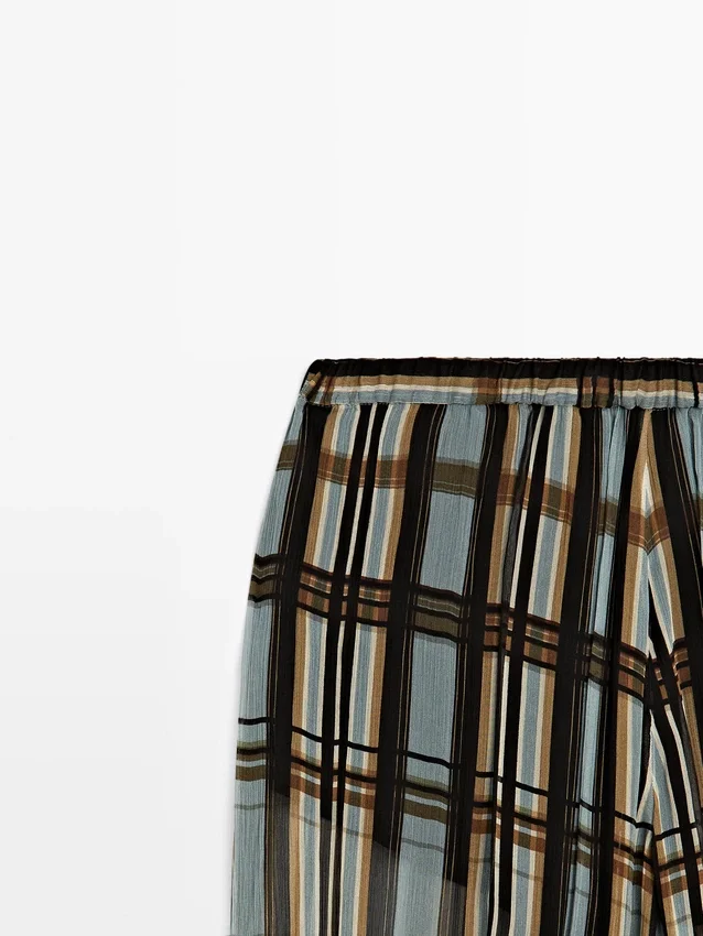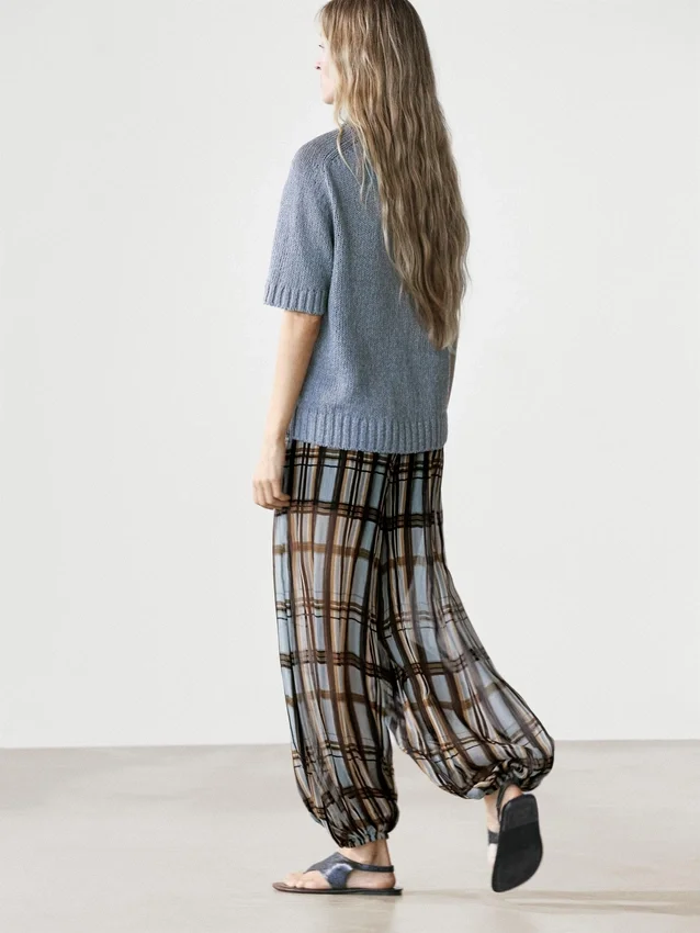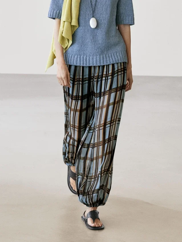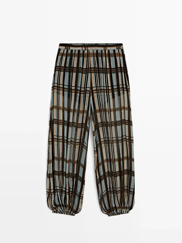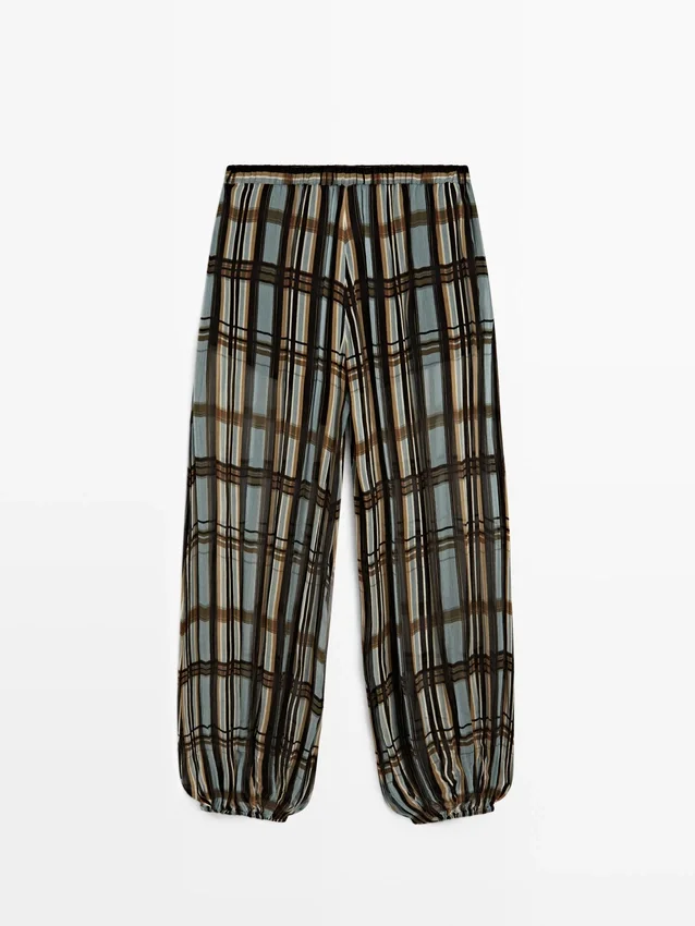 Sarouel Trousers: Loose-Fitting Silhouette, Wide Leg Volume and Ankle Fit.. Side Zip Fastening. Elasticated Back of the Waist. Two Side Pockets. Check Print. Elastic Band Detail at the Hem Area. Lined.