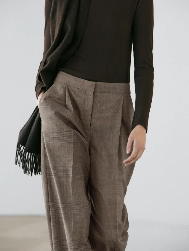 Trousers Made from Wool Main Fabric. Zip Fastening Concealed by a Placket, Button and Buttoned Strap. Two Side Pockets. Check Print. This Garment is Part of a Suit.