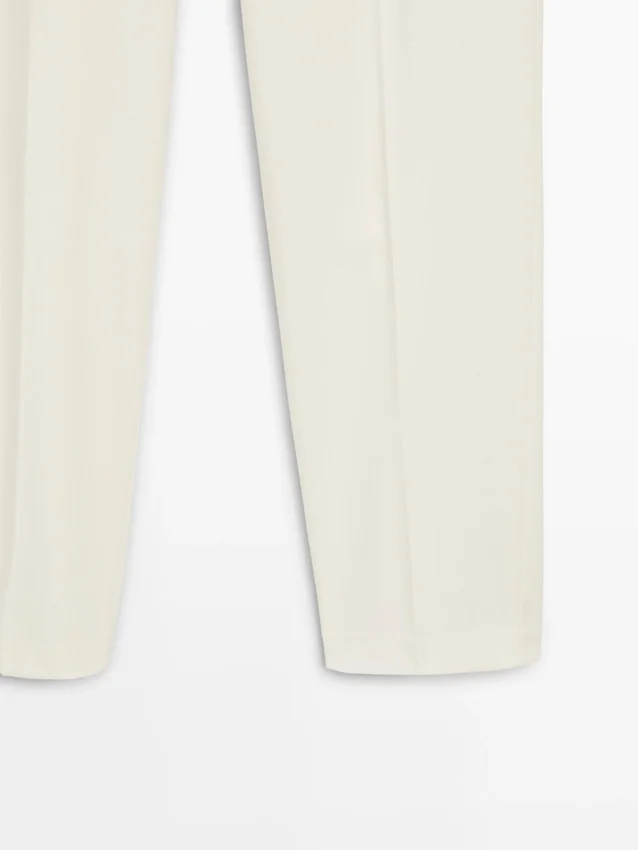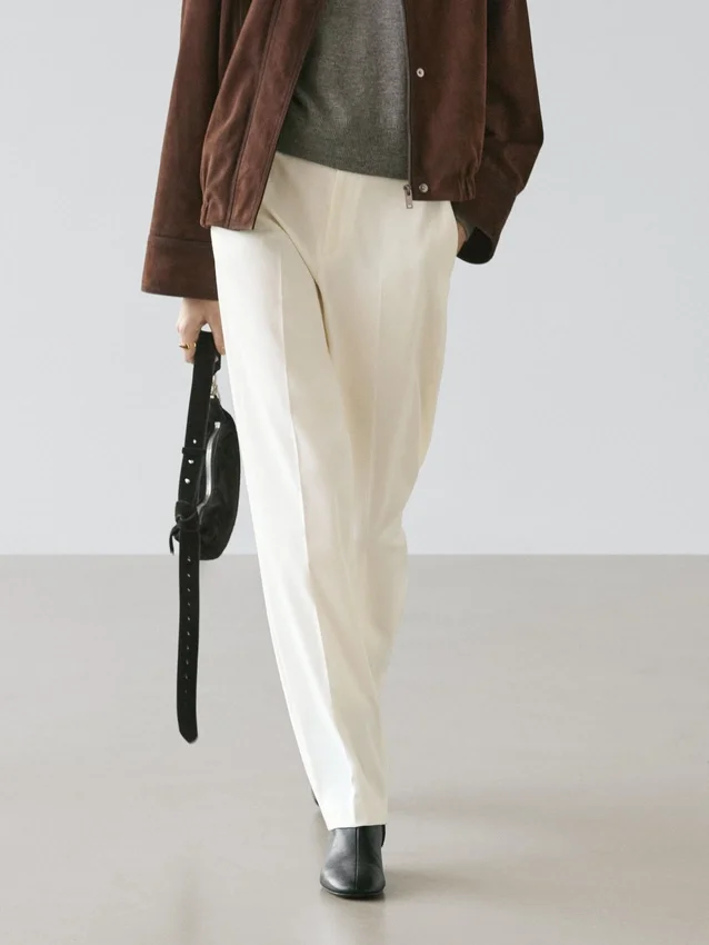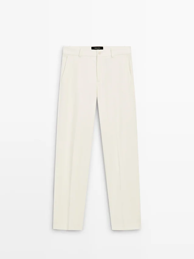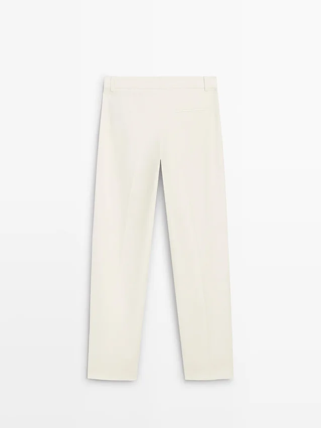 Straight Fit Trousers. Waistband with Belt Loops . Zip Fastening Concealed by a Placket, Button and Buttoned Strap. Two Side Pockets. One Welt Pocket at the Back.